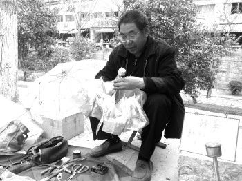 | 赵子明在修伞。本报记者 范少伟 摄 |