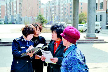 | 3月19日,历城公安分局民警在鲍山花园北区向社区居民介绍非法集资的防范措施。 本报记者 许亚薇 摄 |