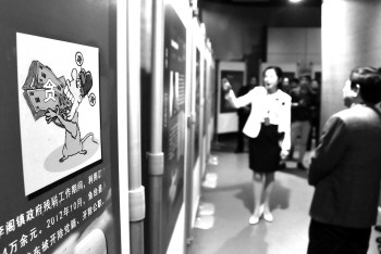 | 图板展现场,讲解员向市民讲解腐败贪污案例。 本报记者 张晓科 摄 |