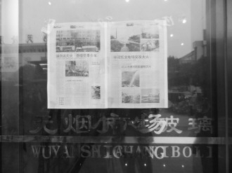 近日,枣庄发生了几起火灾,防火成了市民关注的热点。18日,记者发现,在新昌批发市场的多个商场入口处都张贴了本报对火灾的报道,以此警示商户和顾客防火。商场管理处工作人员表示,为了杜绝火灾隐患,商场里早就被全面禁烟,违者将被处不同程度的罚款。 本报记者 韩微 摄影报道