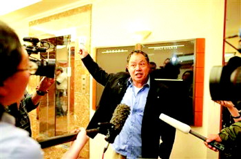 | 23日,丽都饭店,一名家属质疑马航。新京报供片 |