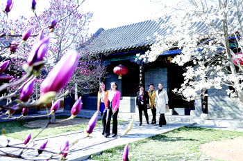 孟府玉兰、玉皇顶杏花、护驾山二月兰……阳春三月,邹城大地柳枝吐绿,百花竞开,处处是花的海洋,市民、游客漫步其中,感受阳光春色,尽享花色芬芳。图为游客们在孟府赏花。