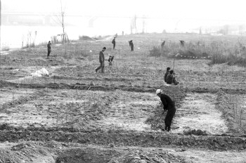 3月24日,在岔河下游的河滩荒地上,不少市民正在垦荒圈地搭建菜园,准备种植作物。