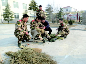 | ◥张海龙和战士们在编扫帚。通讯员 常方元 摄 |