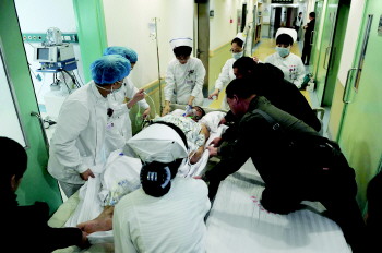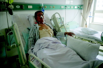 | ▲术后,刘加和只能坐着康复。 |  | ◥24日下午,刘加和转入普通病房。 |