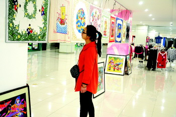 | ▲日照市委常委、宣传部长解世增一行参观书画展。 |  | ◥农民画绣作品引来市民仔细观。