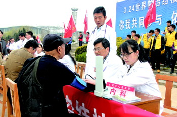 3月24日是世界防治结核病日,日照市人民医院、东港区人民医院等卫生部门在日照市政府广场进行义诊活动。日照市人民医院派出6名医护人员参加义诊活动。义诊现场,专家们对市民进行了健康宣教、健康咨询及常规查体,此次活动共接受健康咨询100余人,发放宣传单和健康教育资料近500份,受到了群众的认可和好评。图为日照市人民医院医生正在给市民义诊。 本报记者 彭彦伟 摄影报道