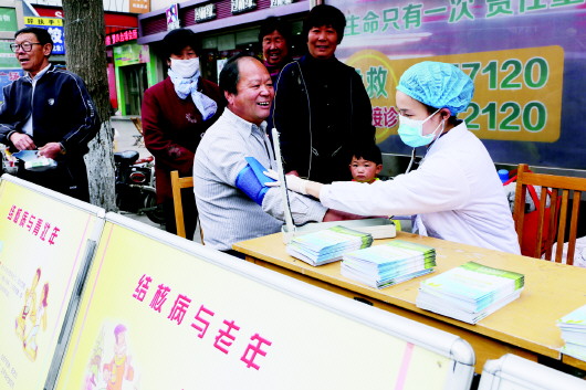3月24日是第19个世界防治结核病日,今年也是《传染病防治法》修订十周年。按照“你我共同参与,依法防控结核”的活动主题,邹平县卫生局组织人员来到城区主要街道路口、公交车内、车站等人员密集场所,宣传结核病的预防措施、主要症状和治疗措施等知识,增强大家对结核病的认识,提高大家对结核病的防治意识。图为护理人员正在为前来咨询的人们测量血压。