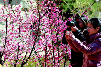 又是一年花好时,红叶谷景区梅花进入盛花期。红梅、绿梅等二十多个品种的梅花竞相绽放,煞是美丽,吸引不少游客前来赏花。花儿们深红浅粉相伴,千朵万朵压枝低。游客们络绎不绝,他们或一家大小,或约朋邀友,共赏花的美景。置身漫步其中,轻风微拂,花枝摇曳,梅花、桃花更显美丽。赏花的游客三五成群,玩耍嬉戏,互相拍照,把绚丽的美景定格在照片中。济南的春天总是短暂,有着即将入夏的势头,来红叶谷寻一份旖旎春意,给心灵一个停靠点,寻一份远离城市喧嚣的宁静。 (徐娜娜)