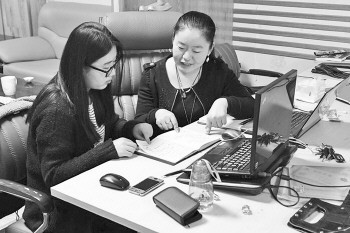 | 曹语宸(右)在指导员工工作。 本报记者 王瑞超 摄 |