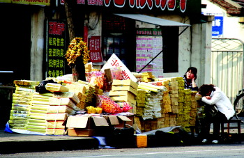 4月1日中午,在解放南大道,路边许多商贩已经摆放上烧纸,而鲜花等文明祭扫用品十分罕见。 本报记者 王小会 摄