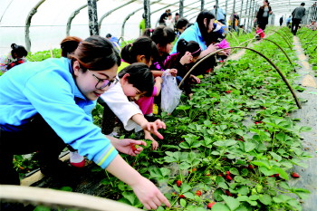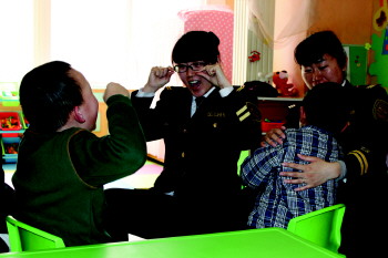 4月2日是“世界孤独症日”,1日下午,青岛汽车总站“580我帮你”志愿者们来到梦圆儿童启智中心,帮自闭症儿童们穿衣服,整理床铺,陪这些“星星的孩子”康复训练(下图)。3月31日,交运集团青岛城际快线公司5辆大巴车载着70余名自闭症儿童到黄岛区,走进大棚开心地采摘草莓(上图)。