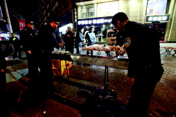 1日晚,在徐州南路上,城管执法人员在查处一家无证烧烤摊。据了解,当晚市南城管执法局在中山路、贵州路、延安三路及南京路等路段展开集中清理整治,截止到当晚9点30分,共清理整治无证烧烤摊、饭店跨门经营烧烤摊十余处。