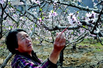4月1日上午,黄岛区黄山经济区岳家村的一名农民正在为桃花授粉。近日气温升高,近3000亩的蜜桃树争相开花,也迎来授粉的好时候,果农要一天两次对桃花进行人工授粉。