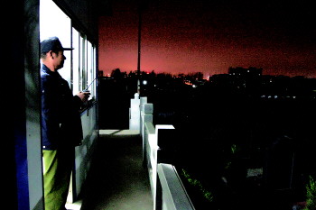 |  | 值班的夜里,老牟手拿对讲机,观察者墓园内的情况。