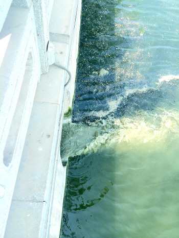 | 黄绿色的污水从雨水口流进小清河。 见习记者 许亚薇 摄 |