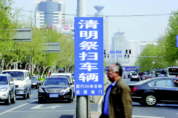 | ◤3日,在济南英雄山路上,交警在靠近英雄山革命烈士陵园的几个路口中间分别竖上了清明祭扫车辆行进的指示牌,提示祭扫车辆按照指示标志行进。