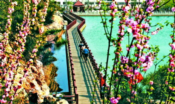 | 景区内的“春水长桥”景观在鲜花的映衬下令人陶醉。 翟华清 摄 |