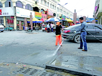 | 济阳县环卫管护中心工作人员正在清理步行街北首的油泥。 实习生 张健 摄 |