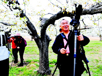 一位老摄影爱好者拍摄梨花。 王宪金 摄