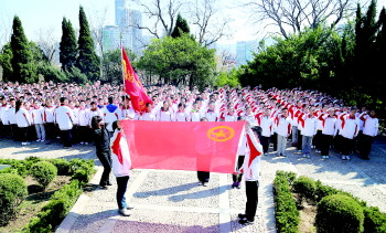 | 3日,烟台十中初二全体学生来到烟台山烈士纪念碑前祭扫先烈,48名学生宣读入团誓言,正式入团。 本报记者 韩逸 摄 |