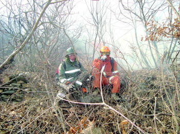 | 灭火作业中,有时累得受不了,队员们不得不原地休息。 芝罘区森林消防供图 |