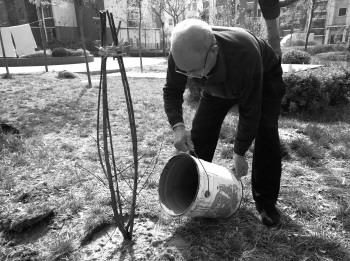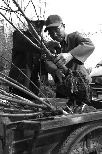 | 美人梅种上之后,杨天云从家中拎来水浇灌。本报记者 张浩 摄 |  | 两人小心翼翼的把树苗放到三轮车上。本报记者 张浩 摄 |