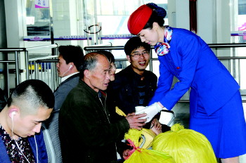| “小红帽”每天微笑着导乘导购、解疑释惑、为旅客倒水。