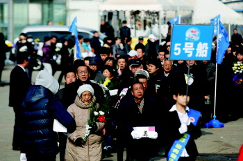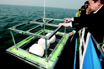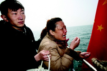 | 家属将装有逝者骨灰的莲花坛放在特制铁架上,为逝者举行沉坛仪式。(资料片) |  | 看着亲人的骨灰洒向大海,一位女士抑制不住自己的情绪,痛哭流涕。(资料片) |  | 2013年4月21日,在八大峡码头,参加海葬仪式的市民准备登船出海。 (资料片) |