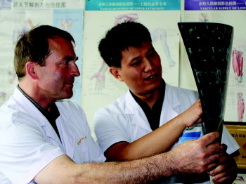 | 市中心医院脊柱外科汪学松博士与德国著名椎间孔镜专家绍克在市中心医院讨论患者病情,并为患者制定手术方案。 |