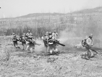 3日,在临港区一墓区,临港区消防队员联合护林员开展森林灭火实战化演练。