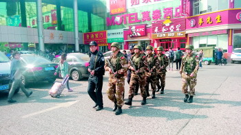 4日下午3时许,在济南长途汽车总站附近,济南市公安局武警、巡警和特警等多警种荷枪实弹,进行武装巡逻。据了解,自3月7日起,济南市公安局在人员密集路段和场所实施24小时全天候“网格化”武装巡逻。半个多月前,公安部曾要求,最大限度地将警力摆上街面。