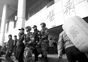 | 4日,荷枪实弹的济南特警、武警、巡警等多警种出现在济南长途汽车总站。 本报记者 左庆 摄 |