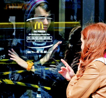| 在辛菲罗波尔一家麦当劳餐厅,店员向顾客示意已经停止营业。 |