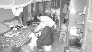 | 4月1日上午,朱敏才在英文课上指导孩子们对话。 |  | 4月1日中午,朱敏才孙丽娜夫妇在自己屋里吃午饭。 |