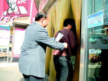 | 两名反扒民警向记者演示掀门帘处的陷阱。 |  | 反扒民警提醒市民,扒手喜欢手持报纸或软包、衣物等。 |  | 拥挤上车的乘客非常容易成为扒手的靶子。 |