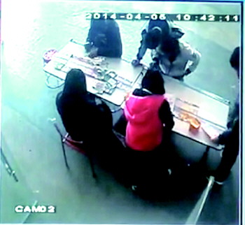 | 监控显示画面中右侧的男子正在顺走彩票。 监控视频截图 |