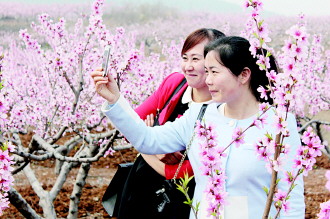 清明节期间,山亭区徐庄镇湖沟村漫山遍野的桃花争芳斗艳,引来了成群结队的游客。图为游客在花丛中留影。 本报记者 刘婷婷 李泳君 本报通讯员 朱宗峰 赵磊 摄影报道