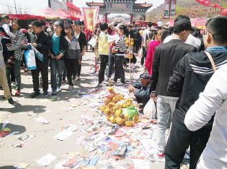 | 青檀寺“清明节庙会”上,到处都是垃圾。 本报见习记者 孙越 摄 |