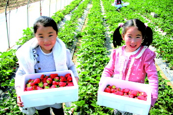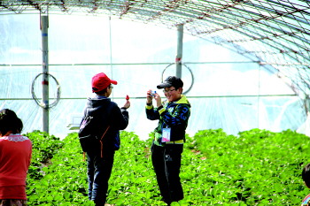 | 草莓棚中一片热闹场景。 |  | 两位小记者展示她们的劳动成果。