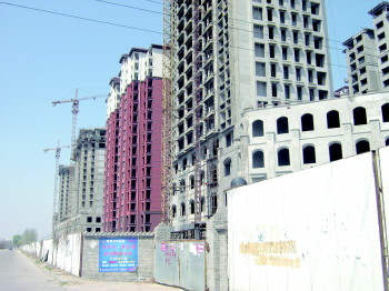 记者发现,工地内楼宇的框架已经完成,但仍有半数住宅楼外墙尚未处理,窗户和玻璃也未安装。