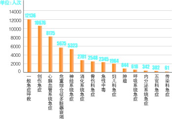 其余呼救症状统计分析为:危重综合征多脏器衰竭5675人次,神经系统急症5323人次,消化系统急症2781人次,骨伤科急症2548人次,急性中毒2345人次,妇儿科急症1964人次,肿瘤844人次,呼吸系统急症618人次,内分泌系统急症342人次,五官科急症302人次,传染科急症61人次。
