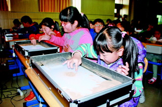 3月29日上午,小记者们早早的赶到蒿泊小学多媒体室,观看沙画表演。“大家想不想上来试一下啊?”经典培训学校的沙画老师刘艺飞问,小记者们按捺不住好奇心,小心翼翼拿着沙子,尝试一个个卡通形象。4月7日上午,在皇冠小学,一个个沙画工具摆好后,小记者们开始兴奋。刘艺飞用紫色沙子开始表演,通过投影仪展示制作沙画的步骤及处理方法。