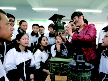 日前,临淄区实验中学各班设“走心家长”岗位,提倡家长用心关爱孩子成长。家长自荐全程参与班级管理、班级活动,家校携手引领学生健康成长。图为初三(11)班家长在“齐文化研究”校本课程中向学生讲解齐国古代器皿鉴定技巧。