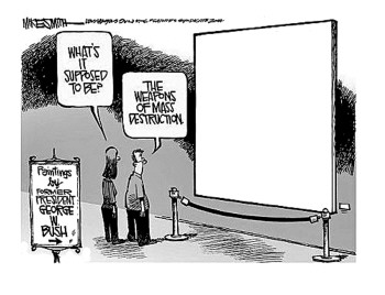 一幅空白的绘画作品吸引了一对男女,女士纳闷道:“本来画的是什么?”男士回答:“大规模杀伤性武器。”立在不远处的牌子上写着:“前总统乔治·沃克·布什的画作。”