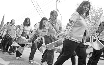12日,在济南环山路上,齐鲁证券有限公司的员工们正在健步行走。当日,为倡导健康生活方式,齐鲁证券有限公司主办、济南市奥丁体育俱乐部承办了以“中国梦健步行”为主题的5公里徒步快走活动。 本报记者 王媛 摄