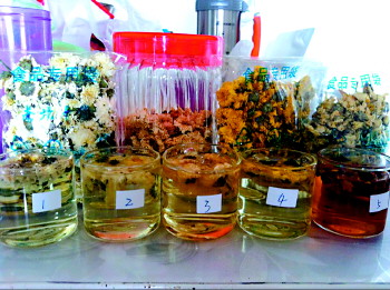 实验>> 冲泡5份菊花茶,一份变色明显 菊花茶冲泡一晚上都能变成绿色吗?记者专门在市场上购买了5种菊花茶,进行冲泡实验。 1号杯子里冲泡从超市买来的杭白菊,2号杯子里冲泡的同样是从超市买来的贡菊,3号杯子里冲泡的是从药店买来的贡菊,4号杯子里冲泡的是彩菊,5号杯子里则冲泡的是一种被称为雪菊的菊花茶。 中午12点钟左右,记者将这5份菊花茶用沸水进行冲泡,没一会儿的功夫,1—4号茶杯中的水都变成了淡黄色,唯独5号杯中雪菊冲泡出来的水略显红色。 6个小时后,记者再次对杯中的水进行观察,发现仍然是之前的颜色,变化不大。12个小时后,变化仍然不明显。 大概20个小时后,记者发现2号杯子中的水由之前的淡黄色变成了绿色,而其它杯中的水没有变化。又过了6个小时,仍然只是2号杯中的水变成了绿色。