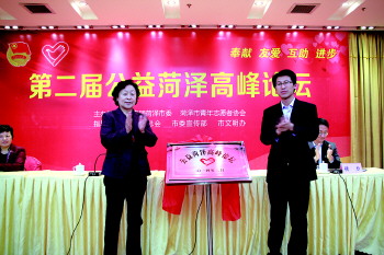 | 菏泽市慈善总会会长童彩云,共青团菏泽市委书记杨东波为“公益菏泽高峰论坛”揭牌。 |