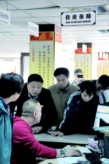 | ◥15日,东山街道办,不少市民排队申请保障房。本报提醒,任何工作日都能申请,市民不必扎堆。 本报记者 李泊静 摄 |