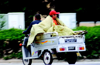 15日,一场小雨伴着降温淅沥地降下,在康博大道上,下班回家的环卫工将毡布披在身上遮挡风雨。 本报记者 马志勇 摄